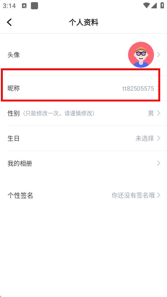 3、在個(gè)人資料界面中,找到昵稱選項(xiàng)并點(diǎn)擊進(jìn)入昵稱修改界面。