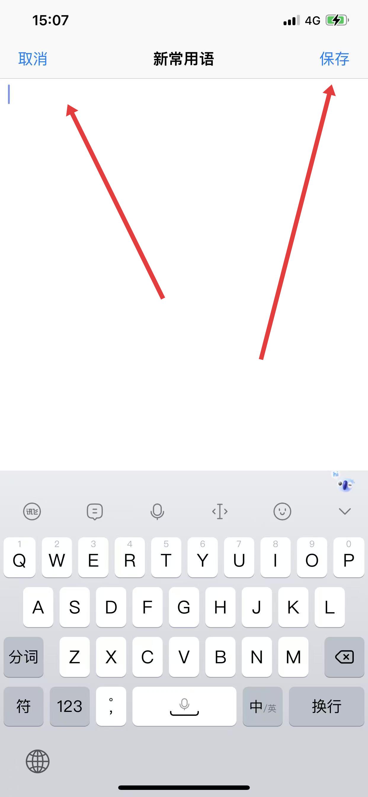 3、在彈出的新常用語輸入框中,輸入想要設(shè)置的常用語內(nèi)容,點(diǎn)擊右上角的保存”,即可完成常用語的設(shè)置。