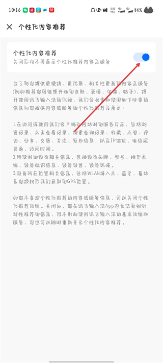 4、將個(gè)性化內(nèi)容推薦的開關(guān)關(guān)閉,即可關(guān)閉。