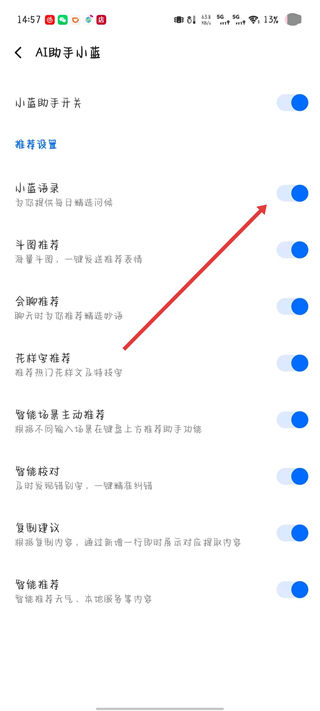 4、找到小藍(lán)語錄選項(xiàng),擊小藍(lán)語錄旁的開關(guān)按鈕。