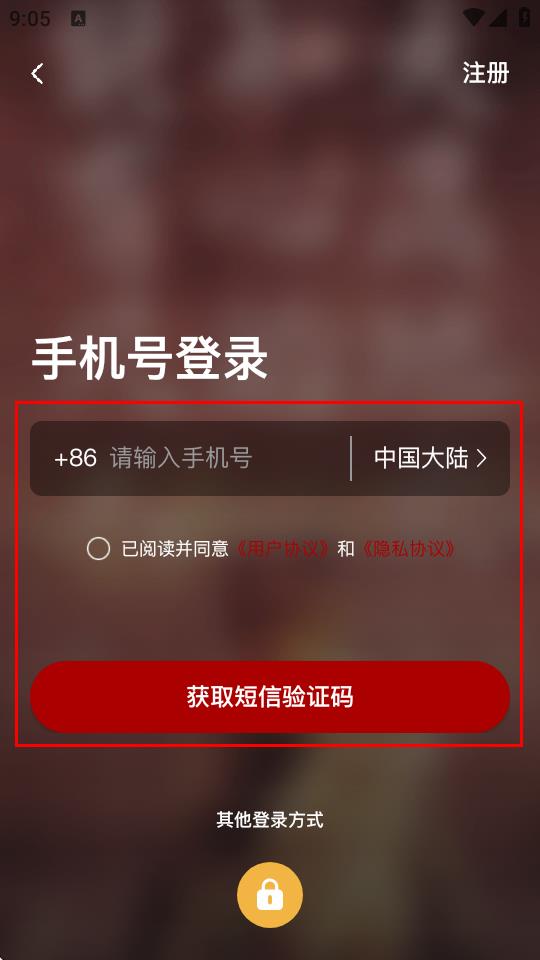 3、進入注冊頁面后,在手機號登錄區(qū)域,輸入手機號,勾選同意用戶協(xié)議和隱私協(xié)議,輸入驗證碼完成注冊。