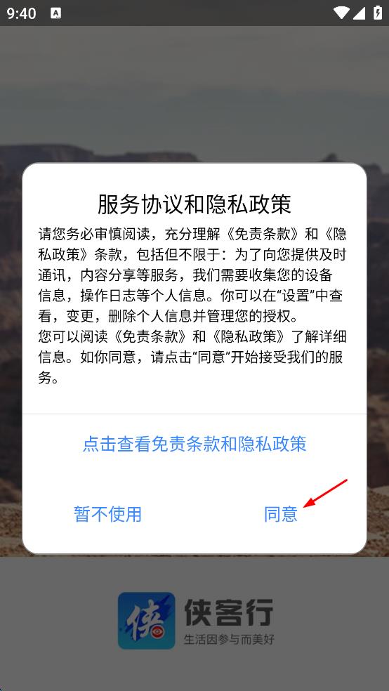 1、打開俠客行APP,在彈出的服務(wù)協(xié)議和隱私政策頁面,點擊“同意”按鈕,進入APP主界面。