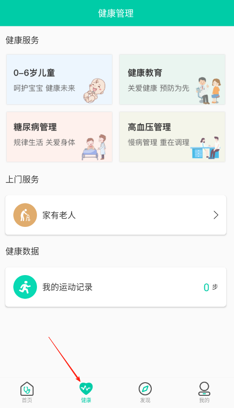 2、切換至健康頁(yè)面,選擇0-6歲兒童糖尿病管理等健康服務(wù),使用家有老人上門服務(wù),查看我的運(yùn)動(dòng)記錄,管理健康數(shù)據(jù),獲取針對(duì)性健康管理方案。
