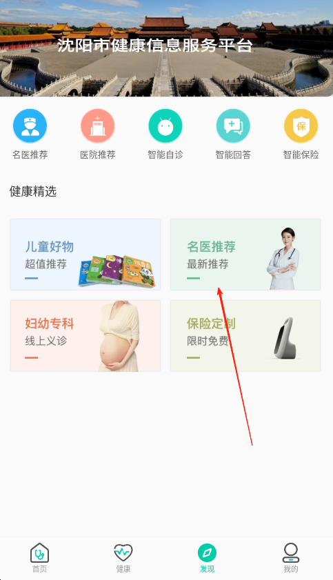 3、進(jìn)入發(fā)現(xiàn)頁(yè)面,利用名醫(yī)推薦醫(yī)院推薦等功能,嘗試智能自診智能回答,參與健康精選內(nèi)容,如兒童好物名醫(yī)推薦,獲取多元健康服務(wù)與資源。