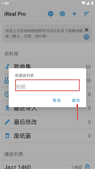 2、在新播放列表的標(biāo)題欄輸入內(nèi)容,點(diǎn)擊成功,完成新播放列表創(chuàng)建。