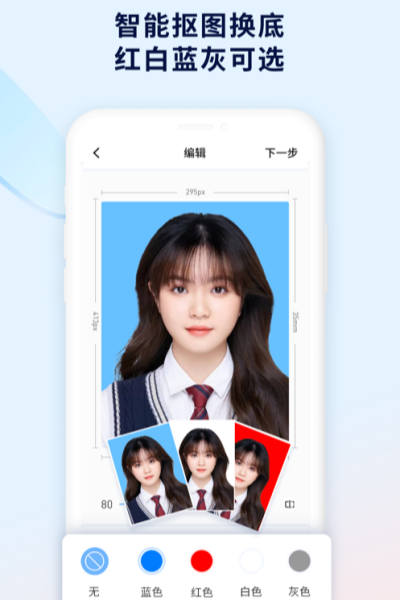 隨時隨地,專業(yè)智能,一鍵get最美證件照,海量尺寸任選+自然美妝調整+一鍵摳圖換底色+多款服裝替換+可保存可沖印可郵寄。