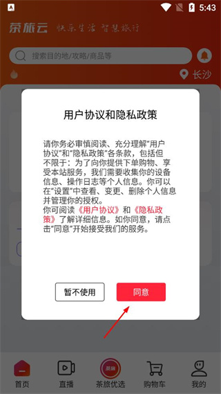1、打開軟件后,查看彈出的用戶協(xié)議和隱私政策提示,點(diǎn)擊同意按鈕,完成該提示的確認(rèn)操作。