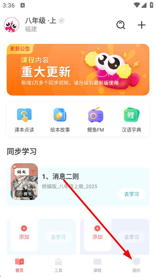 1、在鯉魚(yú)輔導(dǎo)的首頁(yè),需要點(diǎn)擊底部我的按鈕,進(jìn)入個(gè)人頁(yè)面。