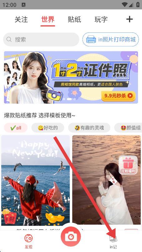1、打開(kāi)in美圖軟件,點(diǎn)擊右下角的in記選項(xiàng)。