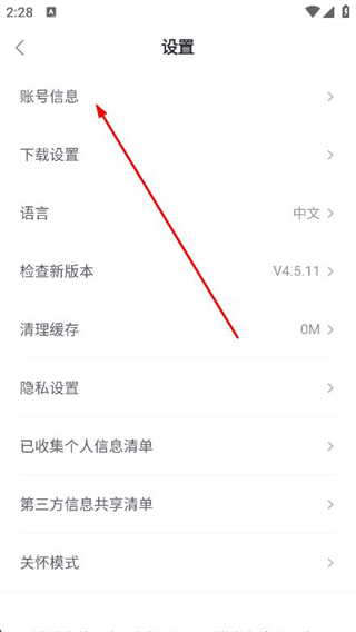 3、進入設(shè)置頁面后,找到并點擊上方的賬號信息選項。