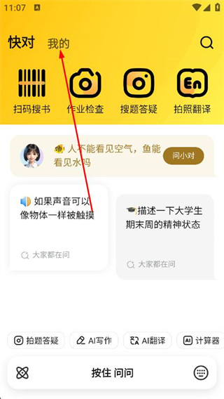 1、打開(kāi)快對(duì)作業(yè)APP,找到并點(diǎn)擊頁(yè)面頂部的我的選項(xiàng)。