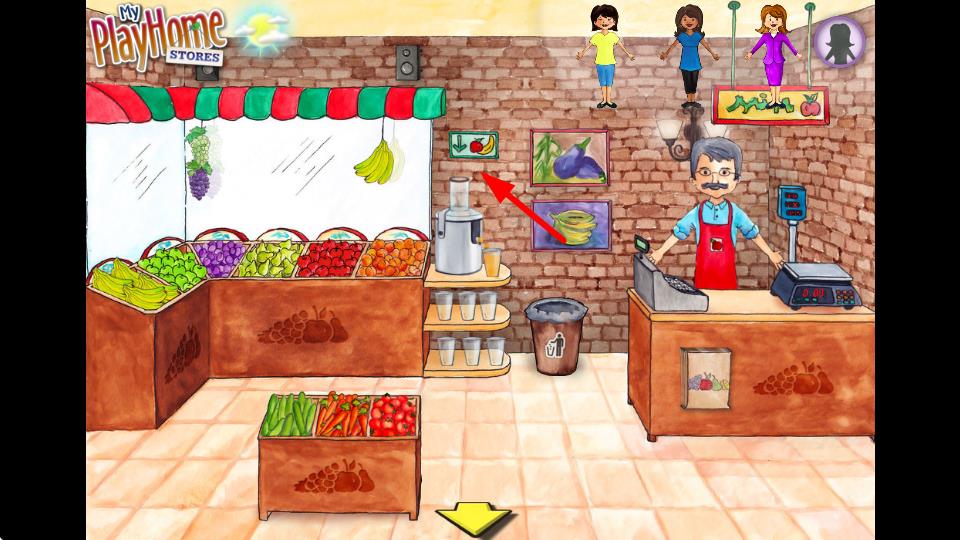 1、在水果店場(chǎng)景,水果拖至箭頭標(biāo)識(shí)f,可觸發(fā)榨汁機(jī)相關(guān)互動(dòng),搭配水果進(jìn)行果汁制作。