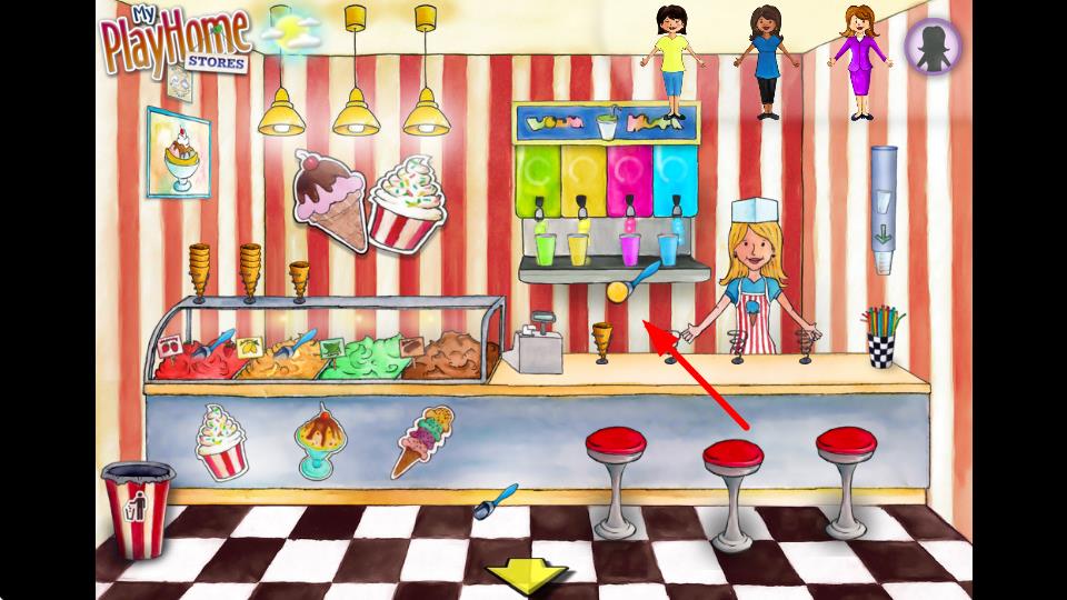 2、冰淇淋店中,按紅色箭頭指向操作,用對(duì)應(yīng)工具從彩色原料區(qū)取物,搭配制作特色冰淇淋。