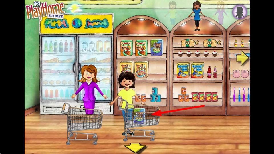 3、超市場(chǎng)景里,操控角色推動(dòng)購(gòu)物車(chē),按箭頭指引選取貨架上商品,模擬購(gòu)物體驗(yàn)。