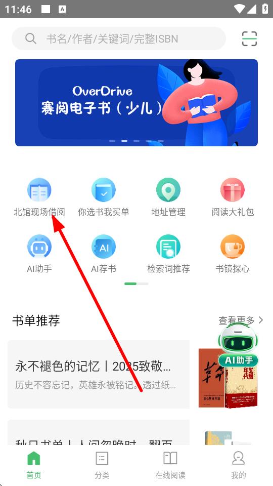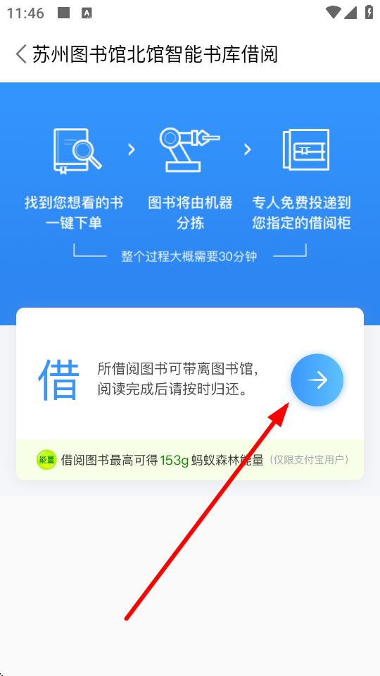 1、打開書香蘇州APP,在首頁點(diǎn)擊北館現(xiàn)場(chǎng)借閱按鈕,進(jìn)入蘇州圖書館北館智能書庫借閱界面。