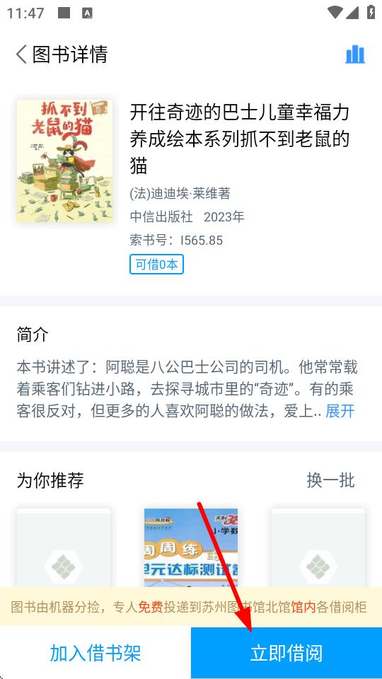 4、點(diǎn)擊想要借閱的書籍,進(jìn)入圖書詳情頁面,確認(rèn)書籍信息后,點(diǎn)擊立即借閱按鈕,按提示完成借書操作。