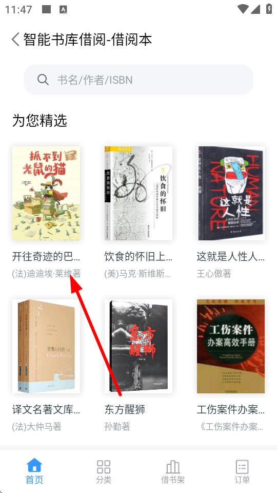 3、在借書選書界面,通過搜索或?yàn)g覽為您精選等板塊,找到想借的書籍,比如抓不到老鼠的貓。