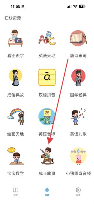 1、打開(kāi)寶寶愛(ài)識(shí)字APP,點(diǎn)擊底部的資源選項(xiàng),進(jìn)入在線資源頁(yè)面。