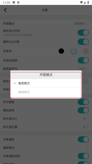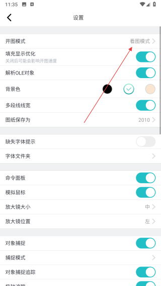 3、在設(shè)置頁(yè)面里,找到開(kāi)圖模式選項(xiàng)并點(diǎn)擊。