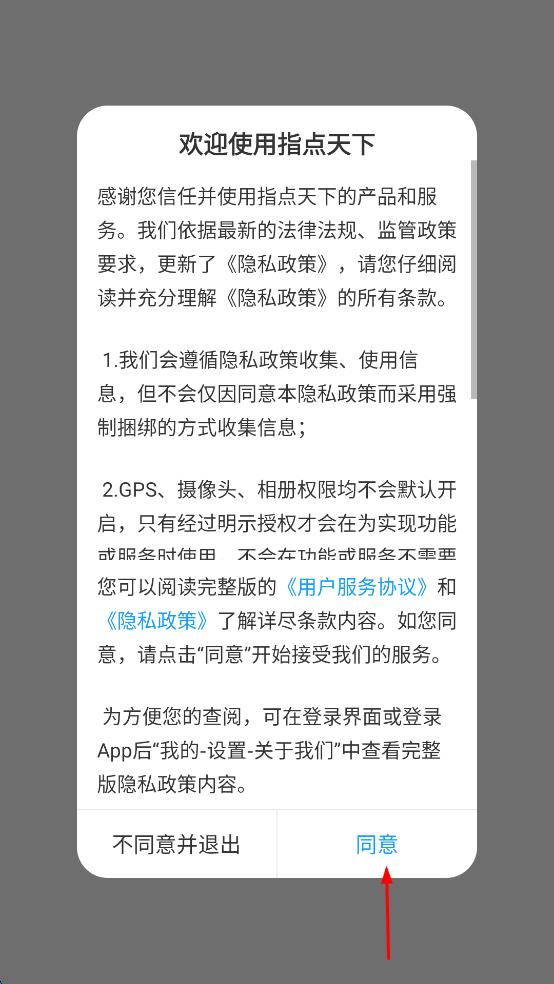 1、打開指點天下app,會彈出歡迎使用提示框,提示閱讀隱私政策等內容,仔細閱讀后,若同意,點擊“同意”按鈕。