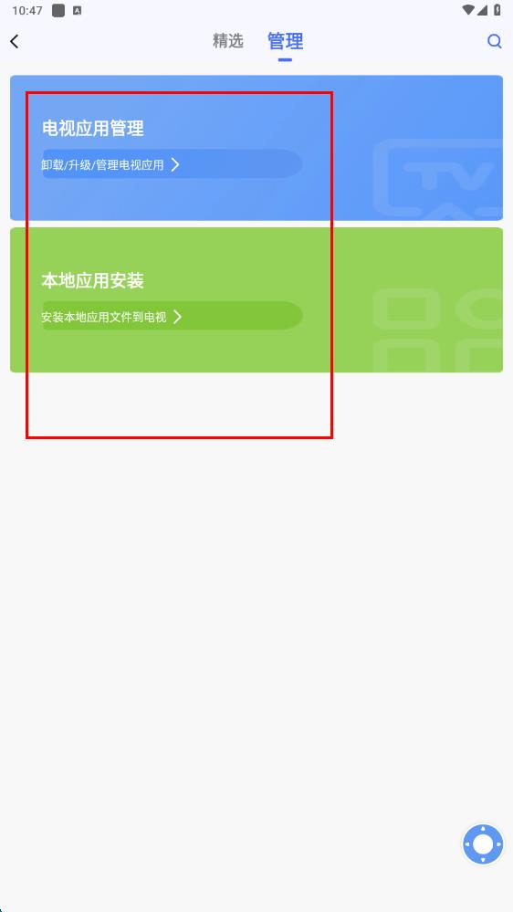 3、點(diǎn)擊電視應(yīng)用管理可對(duì)電視上已安裝的應(yīng)用進(jìn)行卸載、升級(jí)等操作,點(diǎn)擊本地應(yīng)用安”能將手機(jī)本地的應(yīng)用文件安裝到電視上。