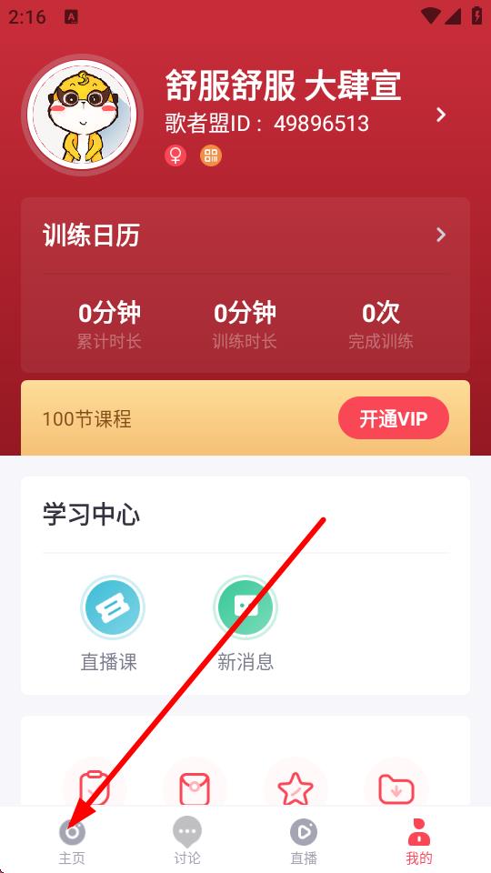 1、打開(kāi)歌者盟學(xué)唱歌APP,點(diǎn)擊底部導(dǎo)航欄中的主頁(yè)選項(xiàng)。