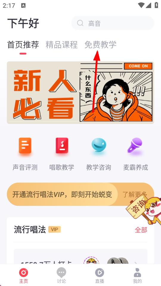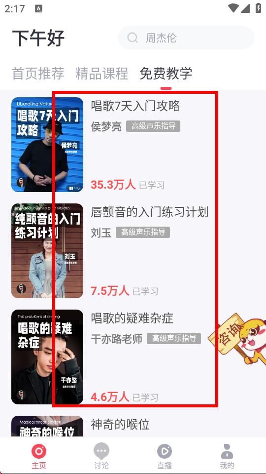 3、進(jìn)入免費(fèi)教學(xué)頁(yè)面后,瀏覽各類免費(fèi)教學(xué)課程,如唱歌7天入門(mén)攻略、唇顫音的入門(mén)練習(xí)計(jì)劃等,選擇你感興趣的課程。