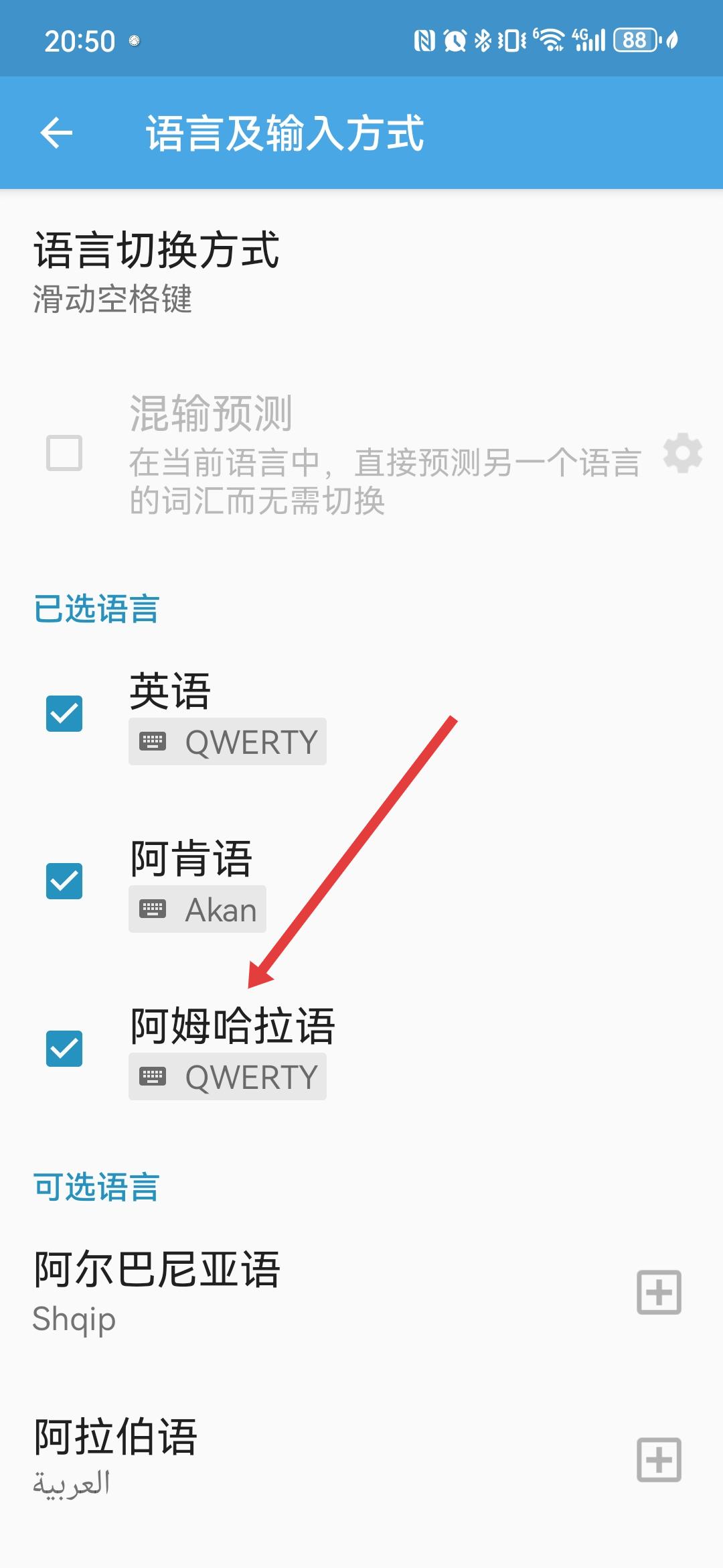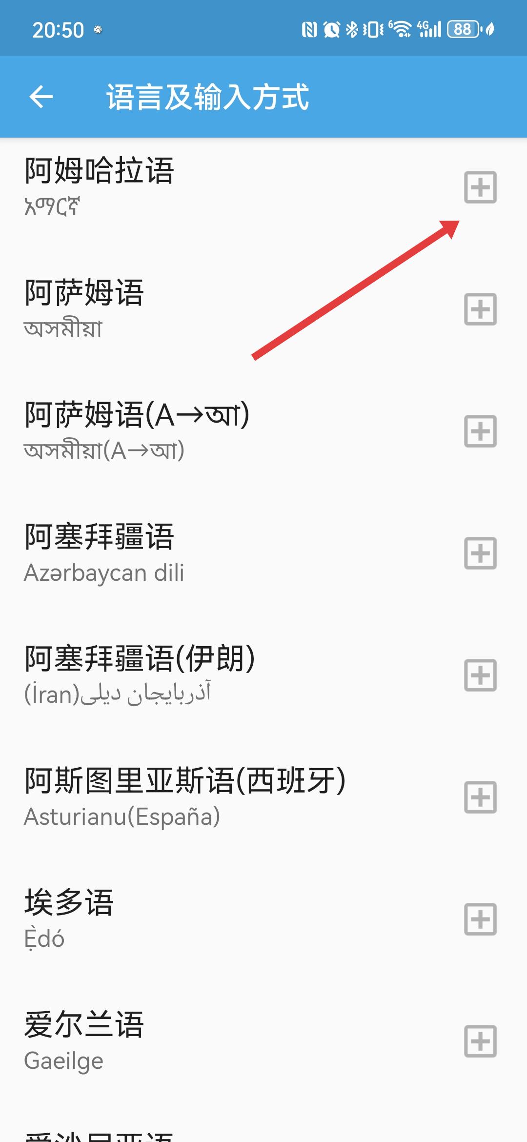 3、在語言及輸入方式頁面,找到需要添加的語言如阿姆哈拉語,點(diǎn)擊其右側(cè)的+號(hào)按鈕。