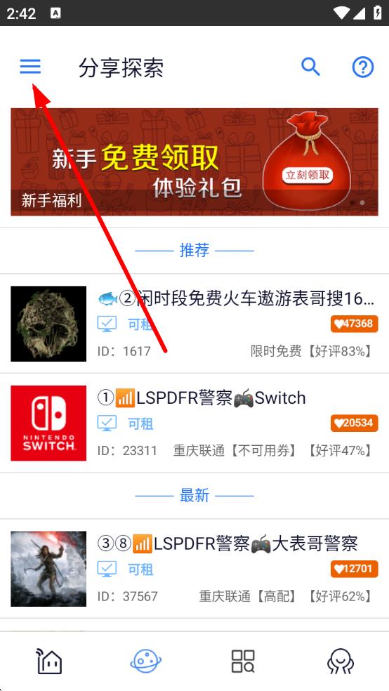 1、打開游戲串應(yīng)用進(jìn)入分享探索界面,點擊左上角三條橫線樣式的菜單圖標(biāo),打開側(cè)邊欄菜單。