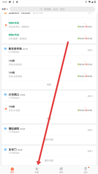 1、點(diǎn)擊界面底部收藏圖標(biāo),進(jìn)入收藏管理頁面,可查看已收藏的公交或地鐵路線信息。