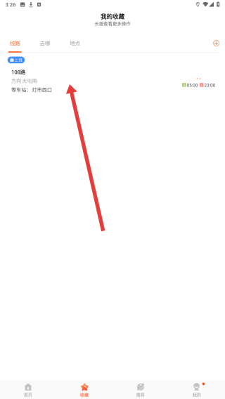 2、在收藏頁面選中已收藏的線路如108路,進(jìn)入線路詳情頁,查看站點(diǎn)分布、運(yùn)營時(shí)間等信息。
