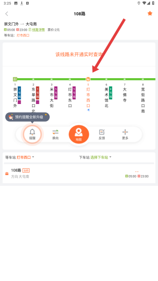 3、進(jìn)入線路界面,可以查看已收藏的公交線路如108路,了解其車站點(diǎn)信息以及運(yùn)營狀態(tài)等內(nèi)容。