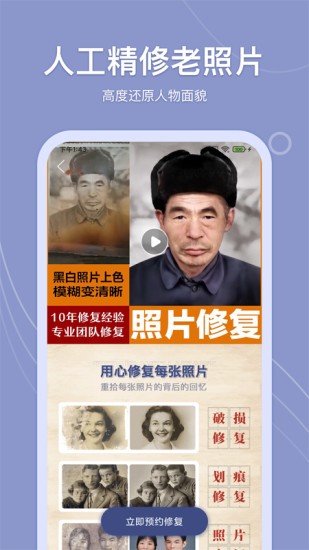 老照片人工精修軟件是非常好用的幫助用戶們快速的修復(fù)各種老照片的手機(jī)app,在這里用戶們能夠找到超多便捷的功能來(lái)對(duì)各種老照片進(jìn)行修復(fù),還能夠讓用戶們?cè)诰€尋找照片修復(fù)師對(duì)照片進(jìn)行修復(fù),一對(duì)一服務(wù),幫助用戶們更好的修復(fù)還原各種老照片,超級(jí)的好用。
