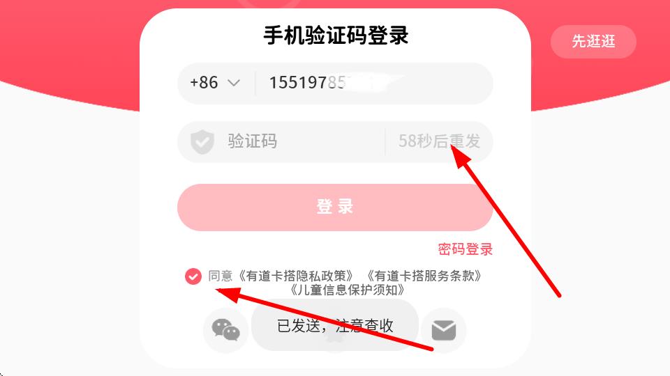 3、勾選同意相關(guān)隱私政策和服務(wù)條款后,待收到驗(yàn)證碼并填入驗(yàn)證碼框。