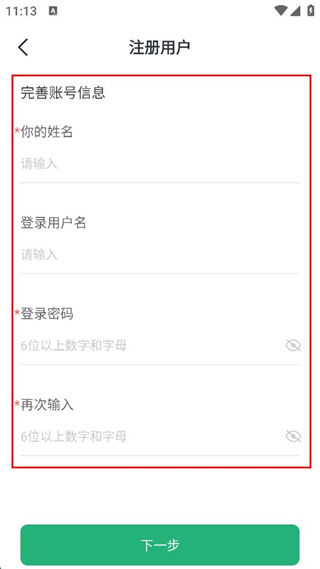 4、在完善賬號(hào)信息頁(yè)面輸入姓名、登錄用戶(hù)名、登錄密碼并再次輸入密碼,完成注冊(cè)流程。