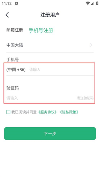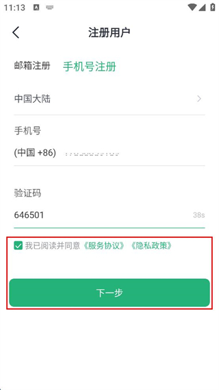 3、勾選已閱讀并同意服務(wù)協(xié)議和隱私政策,點(diǎn)擊下一步。