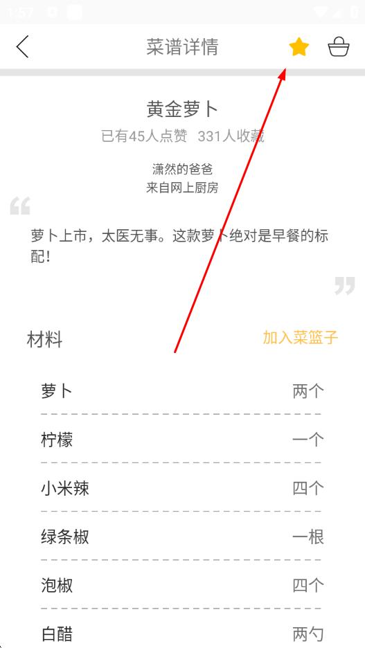 4、在菜譜詳情頁(yè)面,點(diǎn)擊右上方的黃色星星圖標(biāo),即表示該菜譜文章已成功收藏。