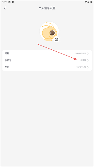 4、在個人信息設(shè)置的界面內(nèi),點擊手機號右側(cè)去設(shè)置。