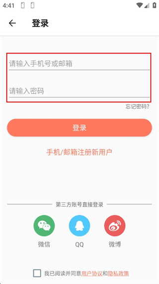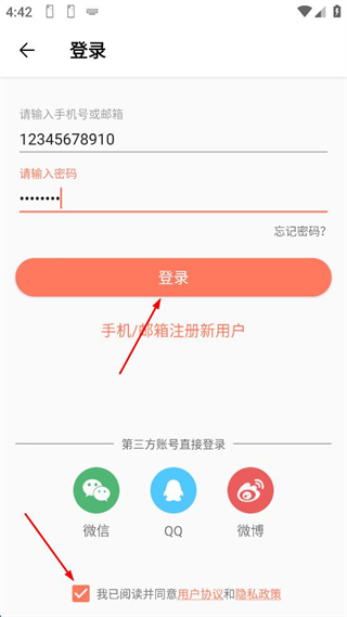 3、輸入手機(jī)號(hào)或郵箱以及密碼,勾選同意用戶協(xié)議和隱私政策。