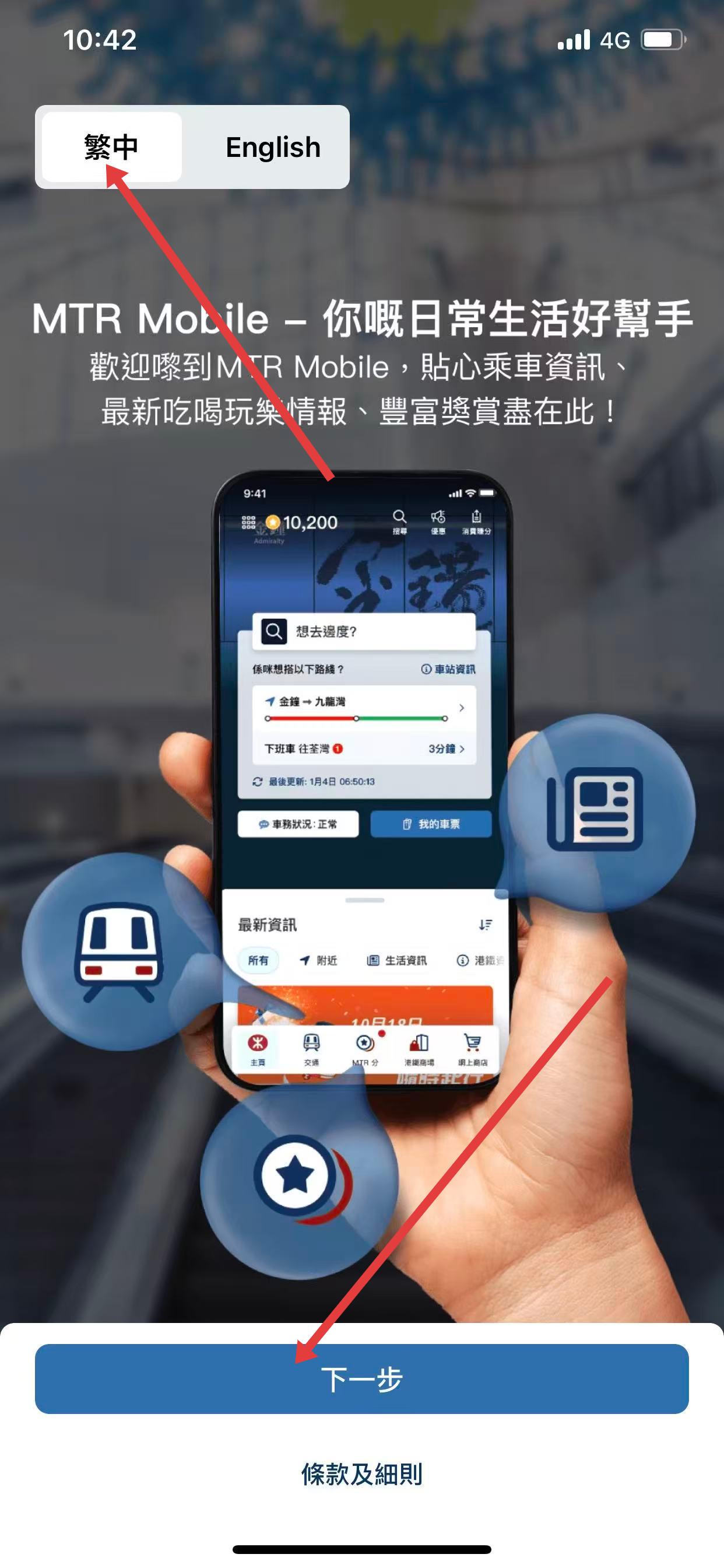 1、打開MTR Mobile應(yīng)用,在初始界面選擇繁中,點(diǎn)擊下一步。