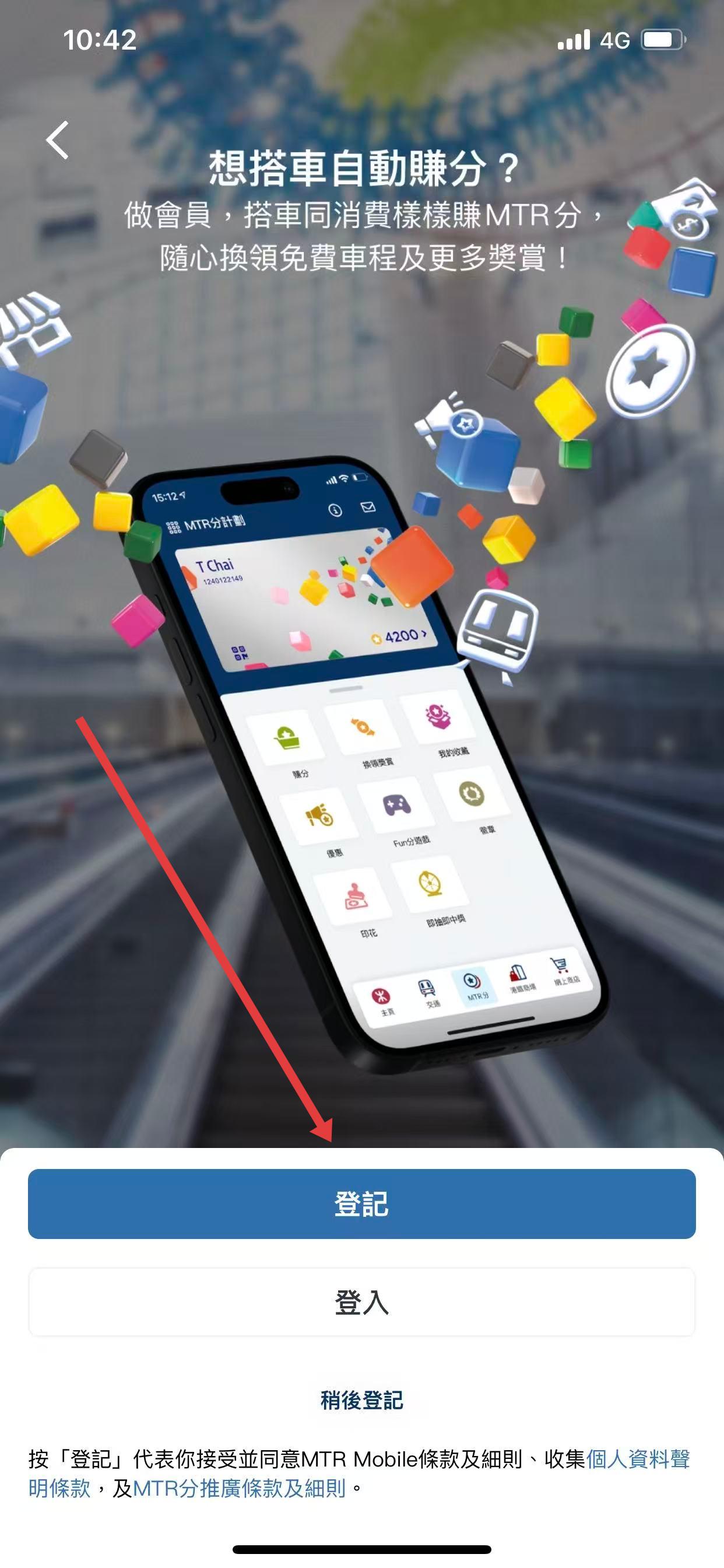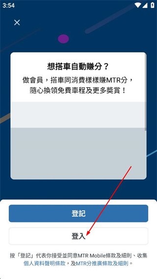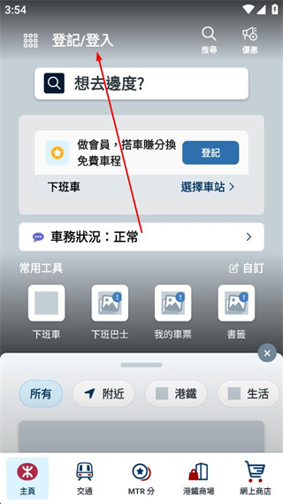1、打開MTR Mobile軟件進(jìn)入主頁,點(diǎn)擊頂部登記/登入選項(xiàng),彈出相關(guān)提示界面。