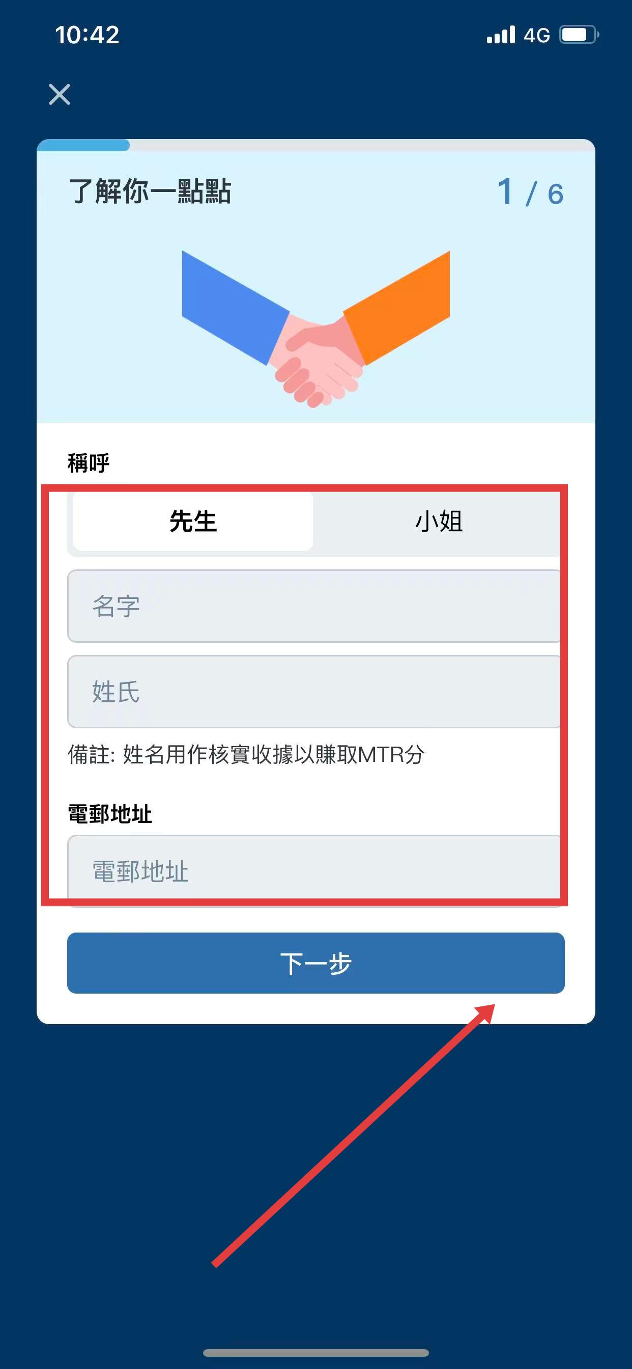 3、在了解你一點(diǎn)點(diǎn)頁面,選擇稱呼,輸入名字、姓氏和電郵地址,點(diǎn)擊下一步。