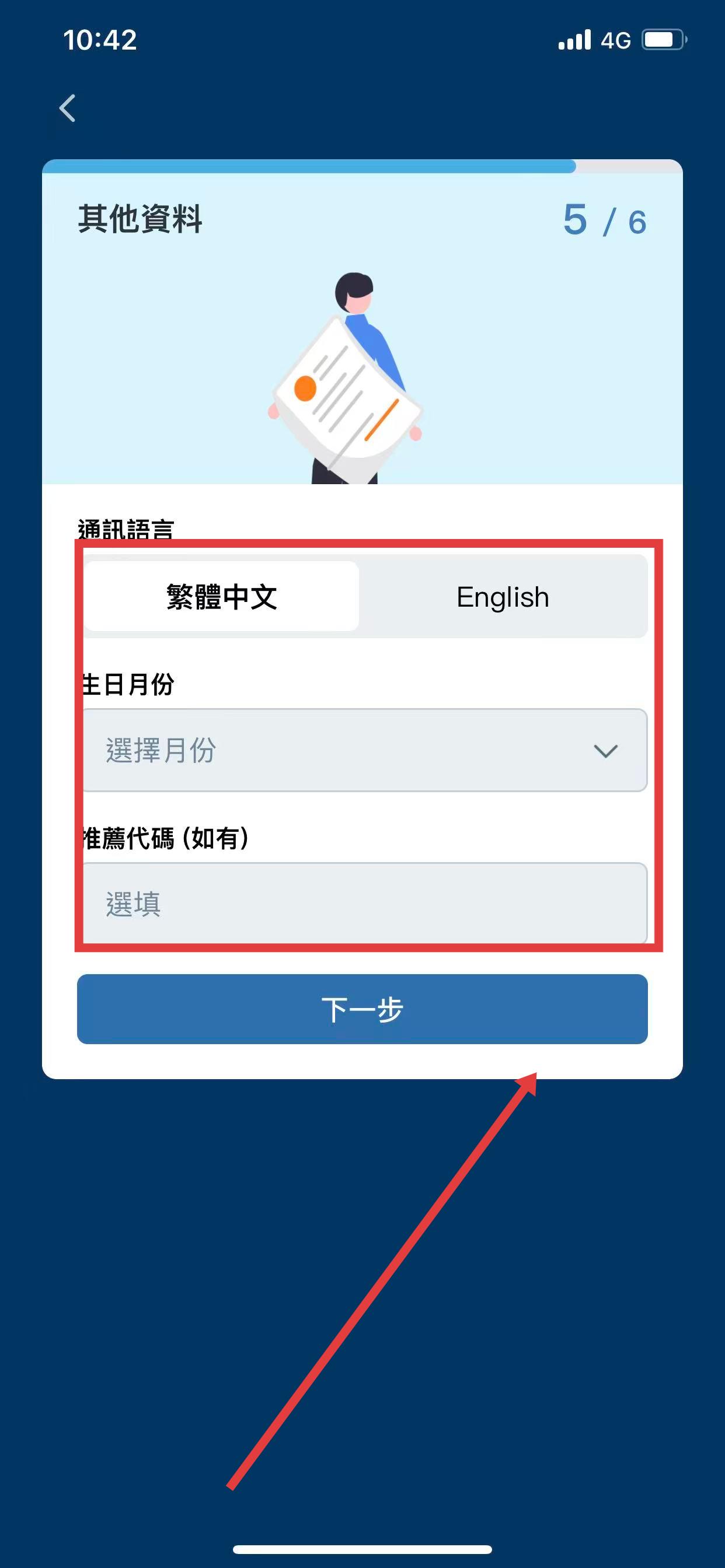 7、在“其他資料”頁面,選擇通訊語言,選擇生日月份,如有推薦代碼可填寫推薦代碼,點(diǎn)擊下一步。