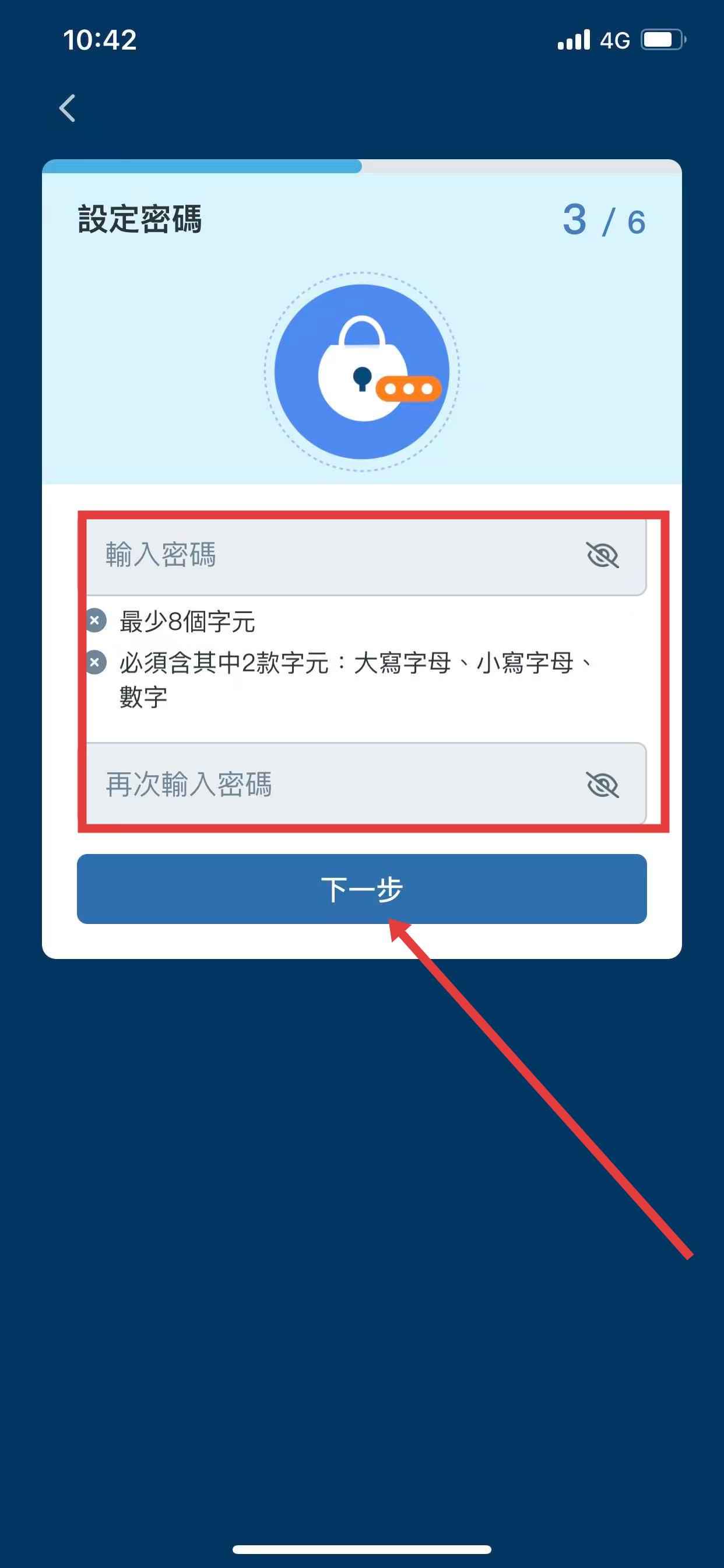 5、在設(shè)定密碼頁面,按照要求輸入密碼,再次輸入密碼進(jìn)行確認(rèn),點(diǎn)擊下一步。