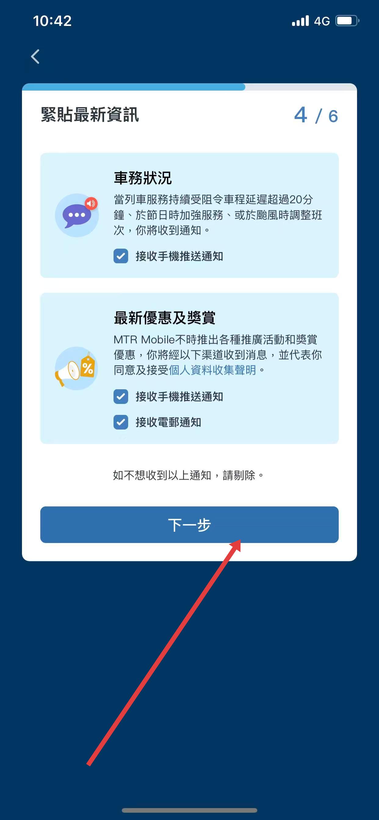 6、在緊貼最新資訊頁面,選擇是否接收車務(wù)狀況、最新優(yōu)惠及獎(jiǎng)賞的通知,點(diǎn)擊下一步。
