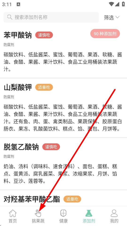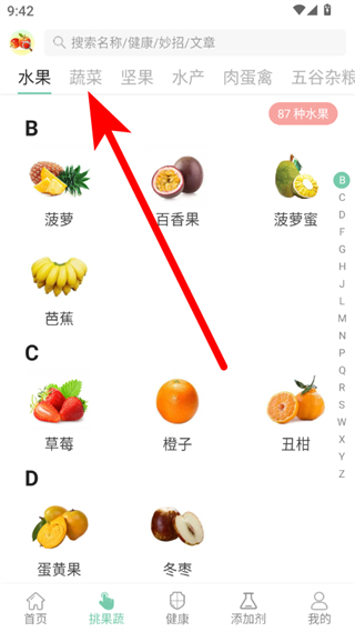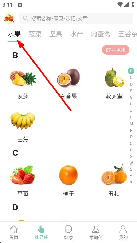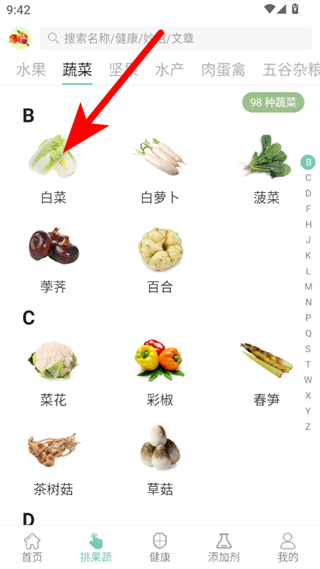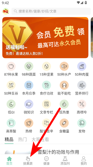1、在果蔬百科首頁,點擊底部挑果蔬選項,進入挑果蔬頁面。