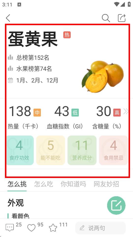 4、進入水果詳情頁,可查看該水果在總榜和水果榜的排名、上市時間,還能看到熱量、血糖指數(shù)、含糖量等數(shù)據(jù)。