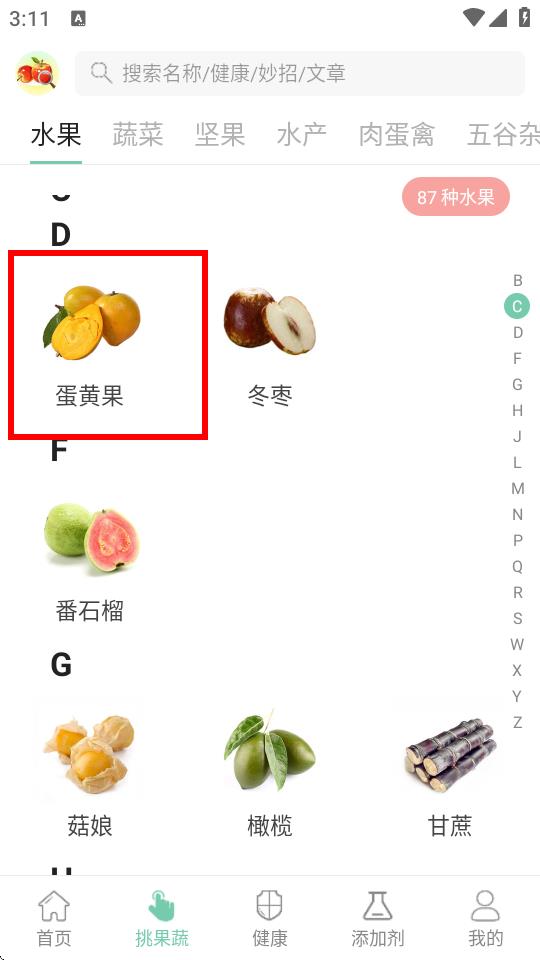 3、在水果列表中找到想了解的水果,如蛋黃果并點擊。