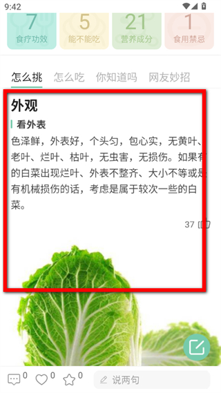 4、在蔬菜詳情頁,查看怎么挑板塊下的內容,即可了解該蔬菜的挑選方法。