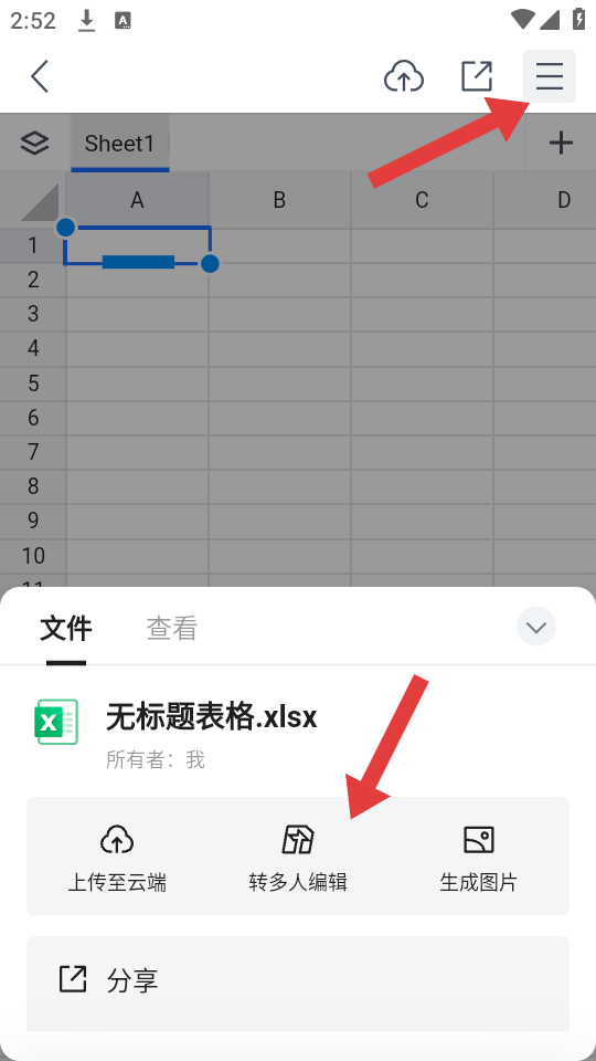 3、表格創(chuàng)建后,點擊右上角三條橫線的菜單按鈕,在彈出的功能欄中選擇轉(zhuǎn)多人編輯,就能將表格設置為在線協(xié)作模式。